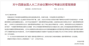据农业农村部消息,近日,农业农村部在对十四届全国人大二次会议关于肥料立法的建议(第0385号建议)和关于制定肥料监督管理类法律法规的建议(第6642号建议)的答复中表示,肥料是重要的农业投入品,直接关系到农作物产量、品质、农业生态环境,关系到农民增产增收和农业绿色可持续发展,进一步完善肥料管理立法具有重要现实意义......