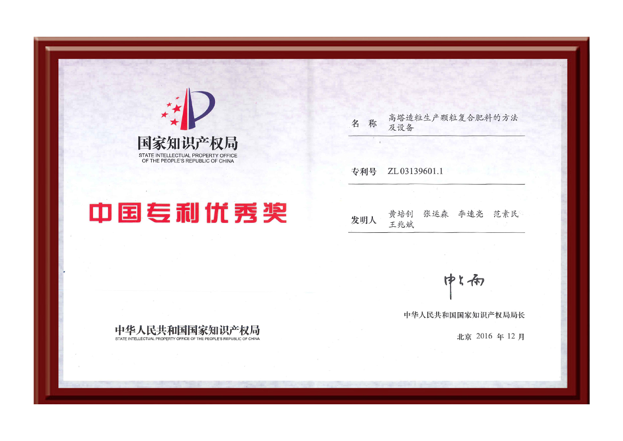 推动我国缓控释肥料技术变革:将传统包膜工艺优化为内添加工艺,并与公司独特的高塔工艺技术结合应用,简化工艺流程,节省生产成本50%,能充分螯合中微量元素,提升肥料多种元素的协同增效作用。荣获《国家技术发明奖》二等奖。