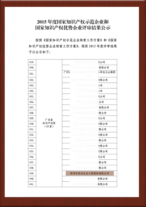 2015年度国家知识产权示范企业和国家知识产权优势企业评审结果公示-439号