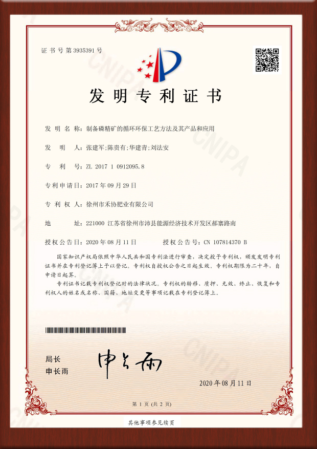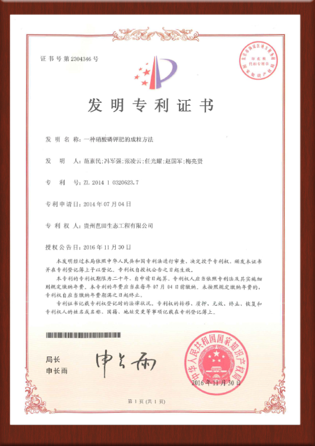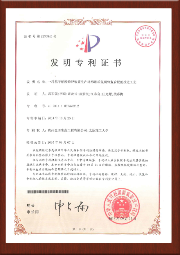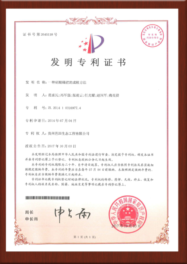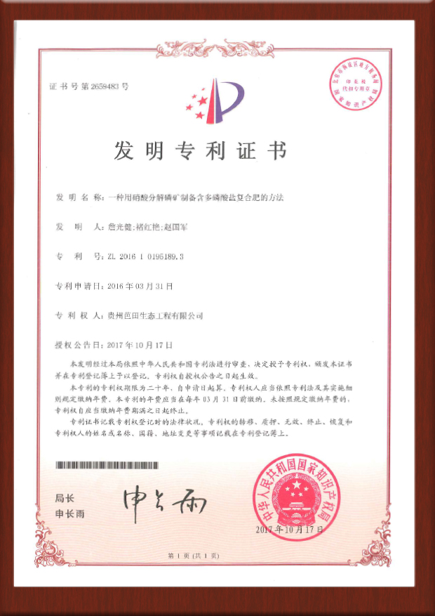 硝酸磷肥专利证书-201611156454.3