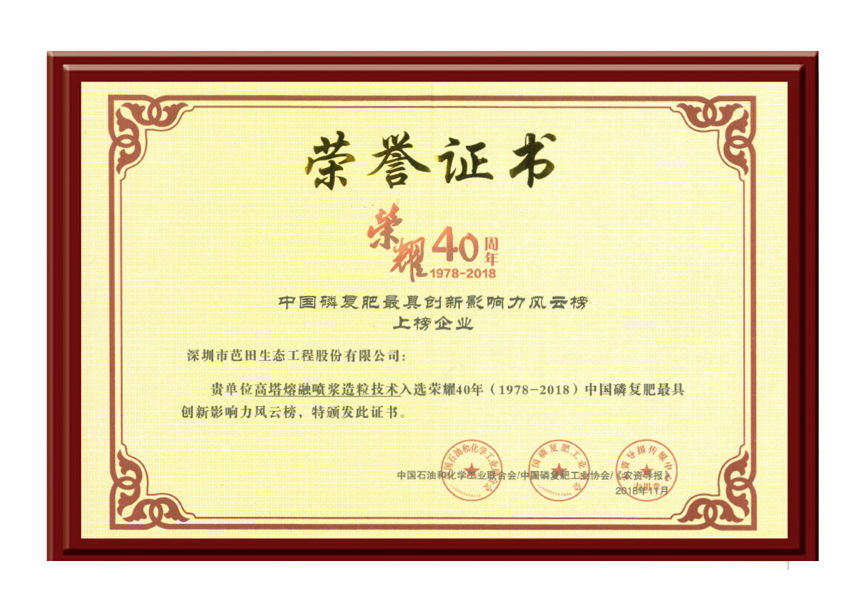 2018年荣耀40年,中国磷复肥最具创新影响力风云榜上榜企业-高塔复肥喷浆造粒技术