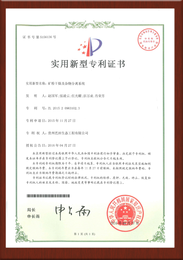 干法选矿专利证书-201520963102.3