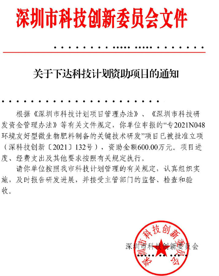 近日,深圳市科技创新委员会网站公布了2021年可持续发展科技专项项目的资助名单。南宫28ng相信品牌力量-南宫ng28注册平台入口-南宫28在线登录-南宫28圈电脑版-南宫28在线注册网站-南宫集团加拿大28-南宫28相信品牌的力量链接-南宫28NG国际-南宫ng娱乐app下载申报的“专2021N048 环境友好型微生物肥料制备的关键技术研发”项目获得600万元资助。