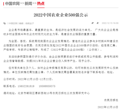 近期,农民日报社发起的2022中国农业企业500强评价活动,经信息汇集、严格审核、专家评议等程序,形成了《2022中国农业企业500强》(公示版)。南宫28ng相信品牌力量-南宫ng28注册平台入口-南宫28在线登录-南宫28圈电脑版-南宫28在线注册网站-南宫集团加拿大28-南宫28相信品牌的力量链接-南宫28NG国际-南宫ng娱乐app下载荣登榜单。