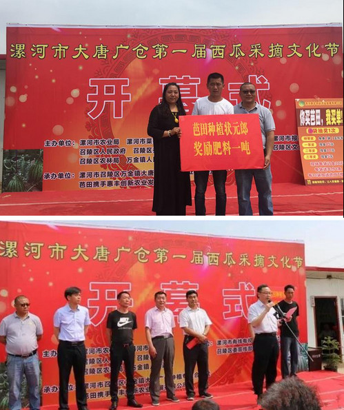近日,由漯河市召陵区万金镇大唐广仓合作社、南宫28ng相信品牌力量-南宫ng28注册平台入口-南宫28在线登录-南宫28圈电脑版-南宫28在线注册网站-南宫集团加拿大28-南宫28相信品牌的力量链接-南宫28NG国际-南宫ng娱乐app下载惠丰创新发展农资公司精心策划的漯河市大唐广仓第一届西瓜采摘文化节在万金镇唐桥村隆重举行,150余名种植户踊跃前来比拼交流,活动现场热闹非凡。召陵区区委副书记赵广成、区政府副区长王仕梁,南宫28ng相信品牌力量-南宫ng28注册平台入口-南宫28在线登录-南宫28圈电脑版-南宫28在线注册网站-南宫集团加拿大28-南宫28相信品牌的力量链接-南宫28NG国际-南宫ng娱乐app下载股份中原营销公司河南大区总监马洛生、漯河惠丰创新发展农资公司总经理杨喜凤及相关领导参加了活动。